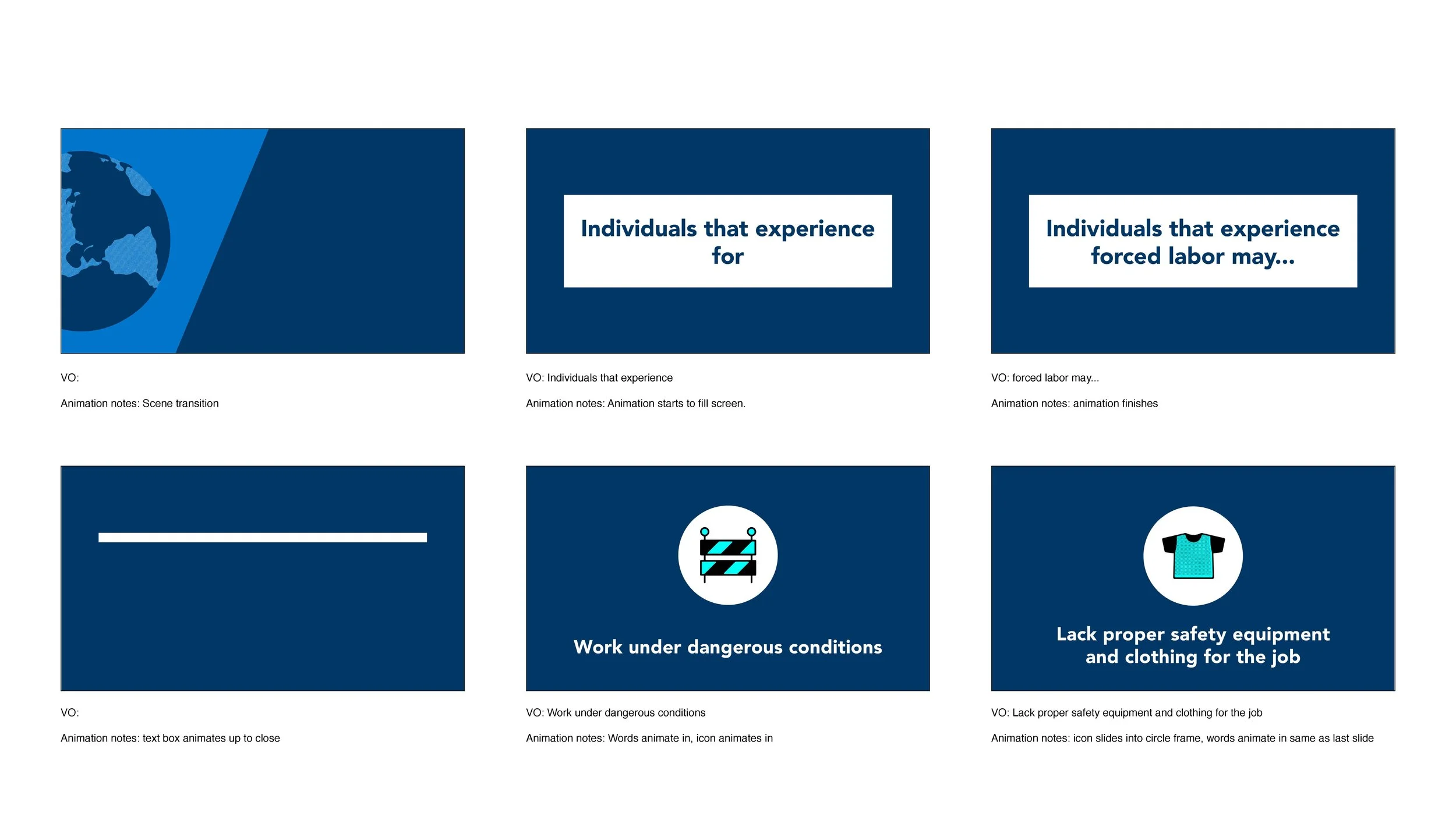 The goal of this educational series of 5 videos for Blue Campaign, a campaign of the Department of Homeland Security, was to teach the audience about the warning signs of Forced Labor, what Forced Labor may look like, and how to report it to authorities.